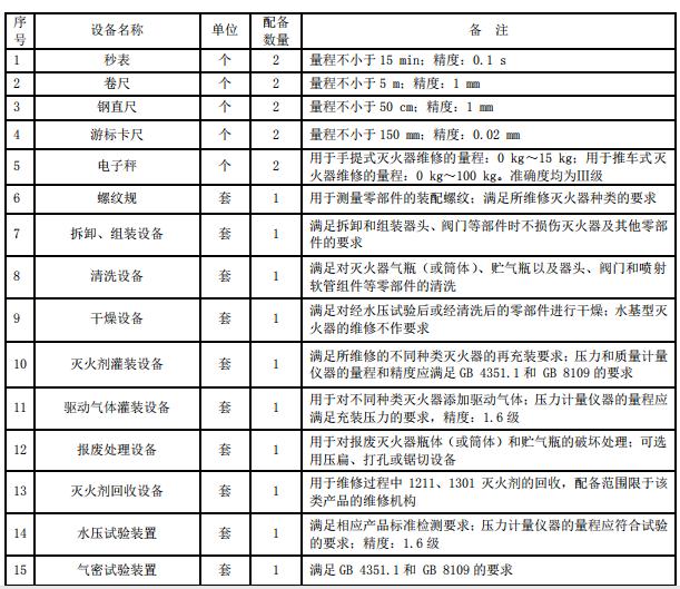 三級消防設施維護保養西寧檢測設備用于滅火器的檢查、維修、更換滅火劑及回收,其設備配備的種類和數量至少應滿足表 3 的要求。