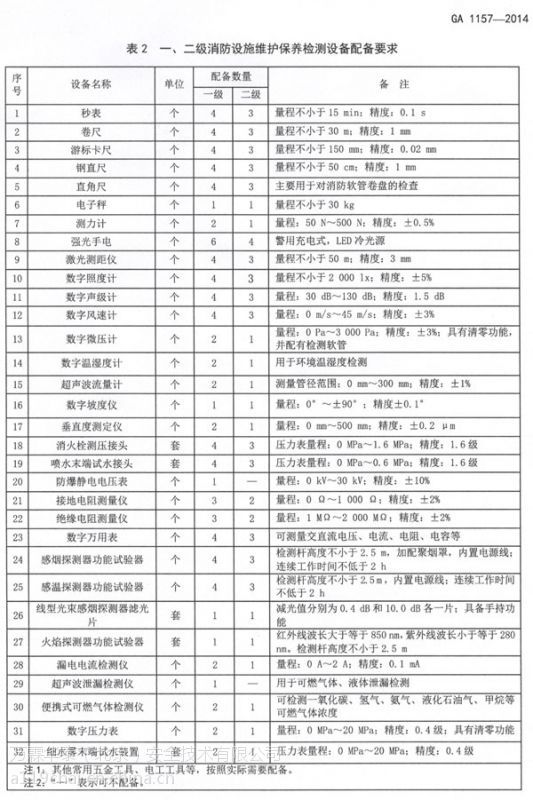 一二級消防設施維護保養西寧檢測設備用于建筑消防設施的維護、保養和檢測,其設備配備的種類和數量至少應滿足表 2 的要求
